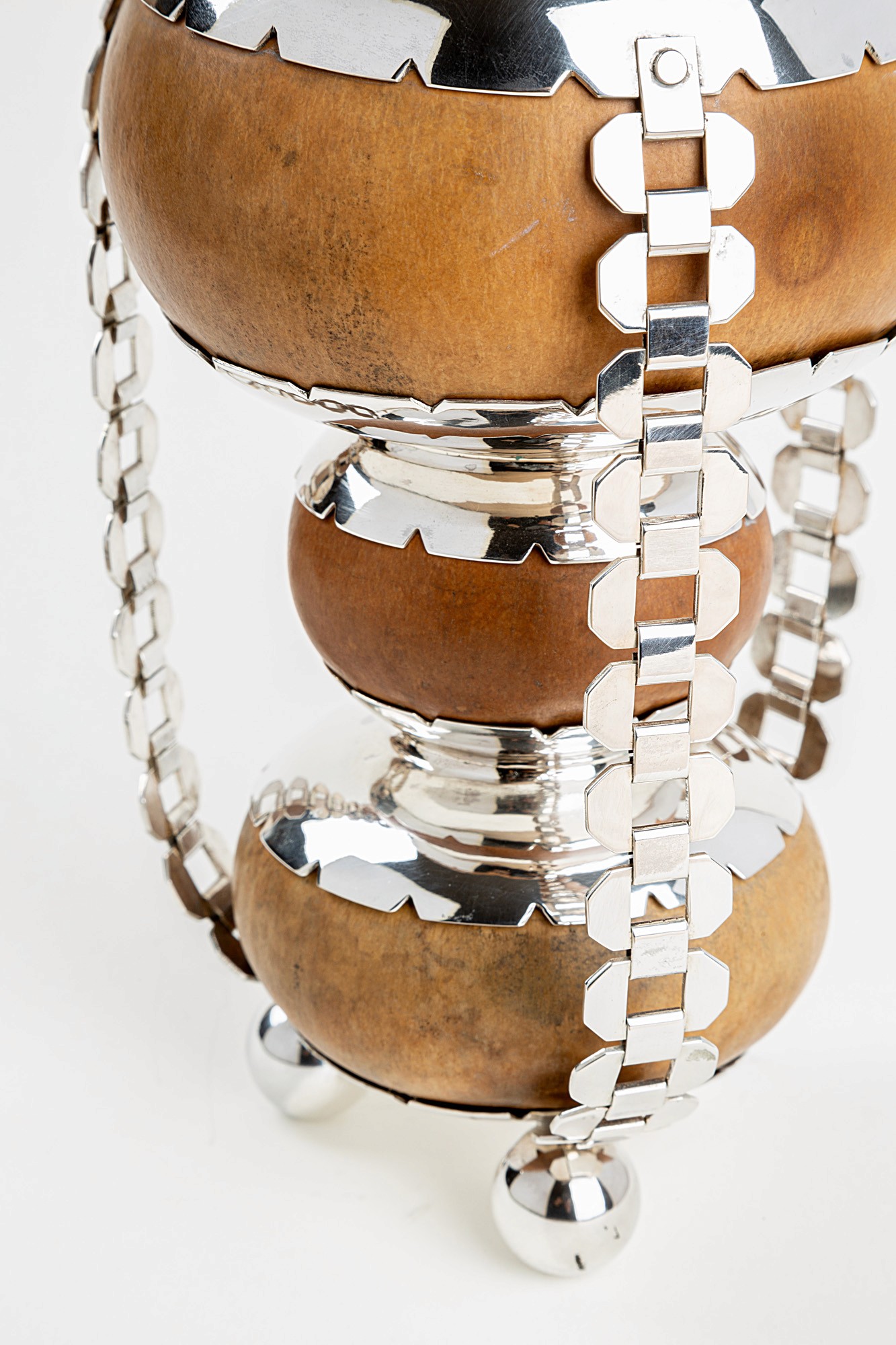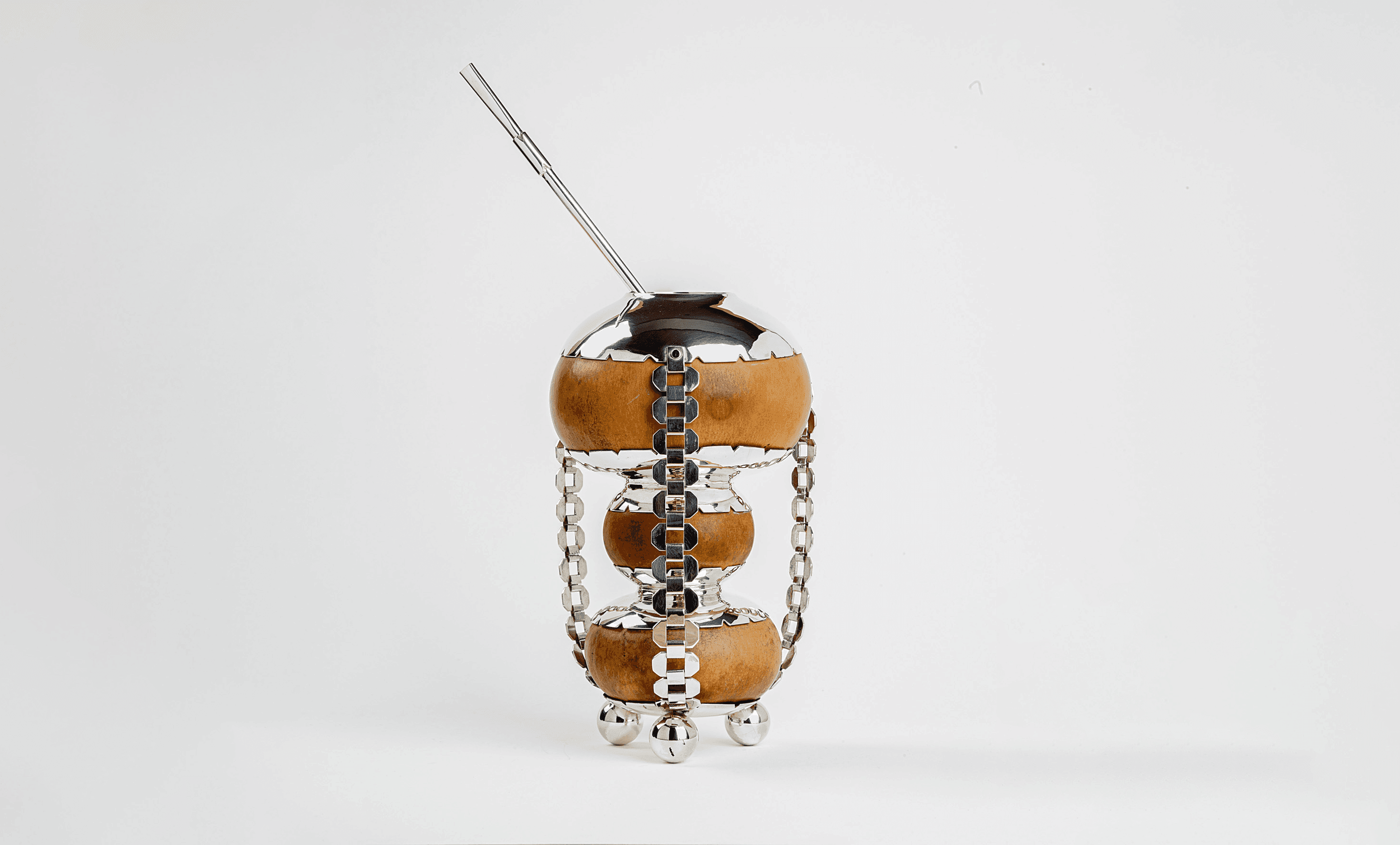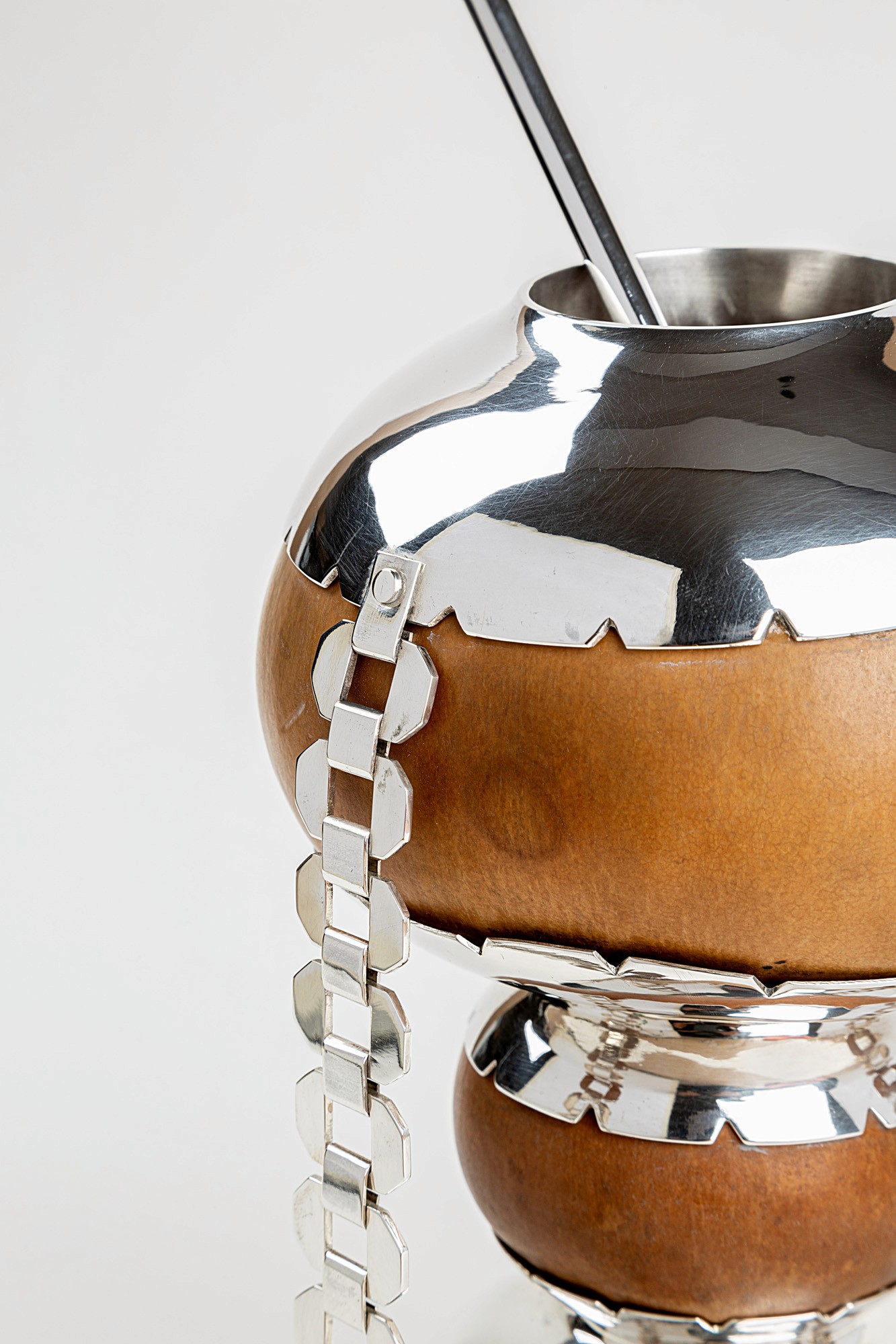 Silverwork was first produced in the Río de la Plata when precious metals started arriving from the high regions of Peru, setting off a syncretism of Indigenous techniques and the European legacy.In this mate gourd, I combine the organic shape of the squash with the tradition technique known as chapeo.Using ensembles of silver cloths found in Creole saddles, symbols of the pride and prestige of men from the countryside. Named after the pretal, an ornate breastplate often decorated with links and ties.The use of those elements in a free interpretation of a traditional Argentine object is an attempt to represent the gaucho spirit.