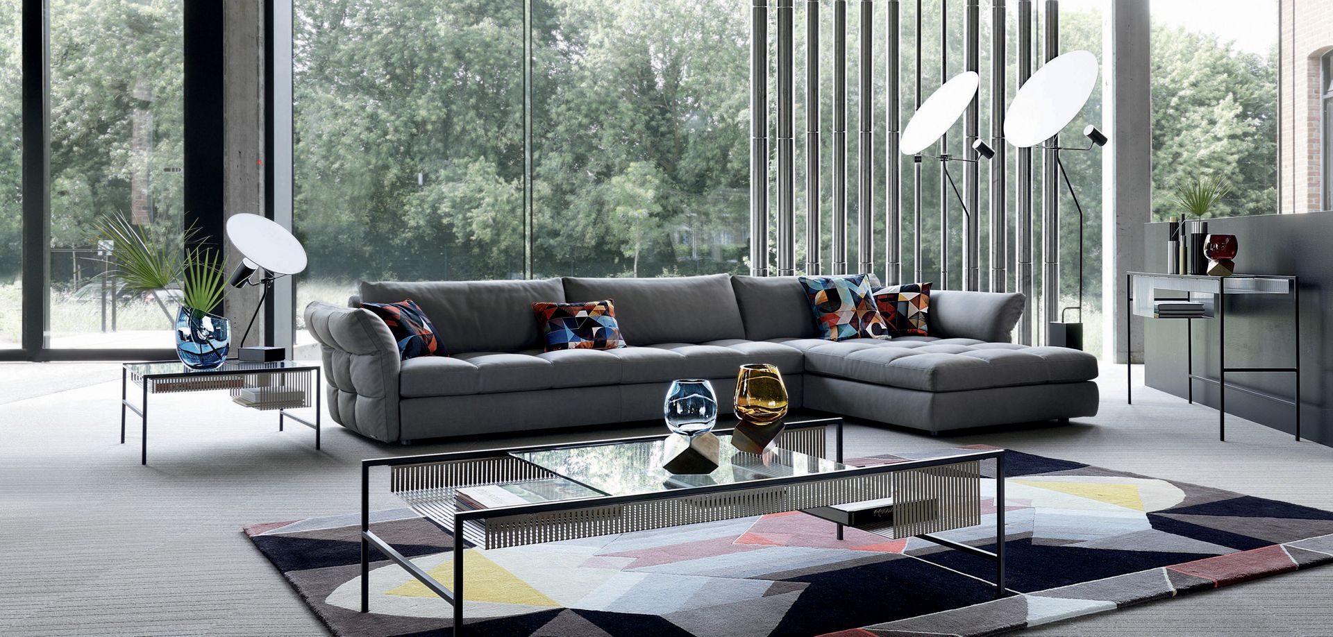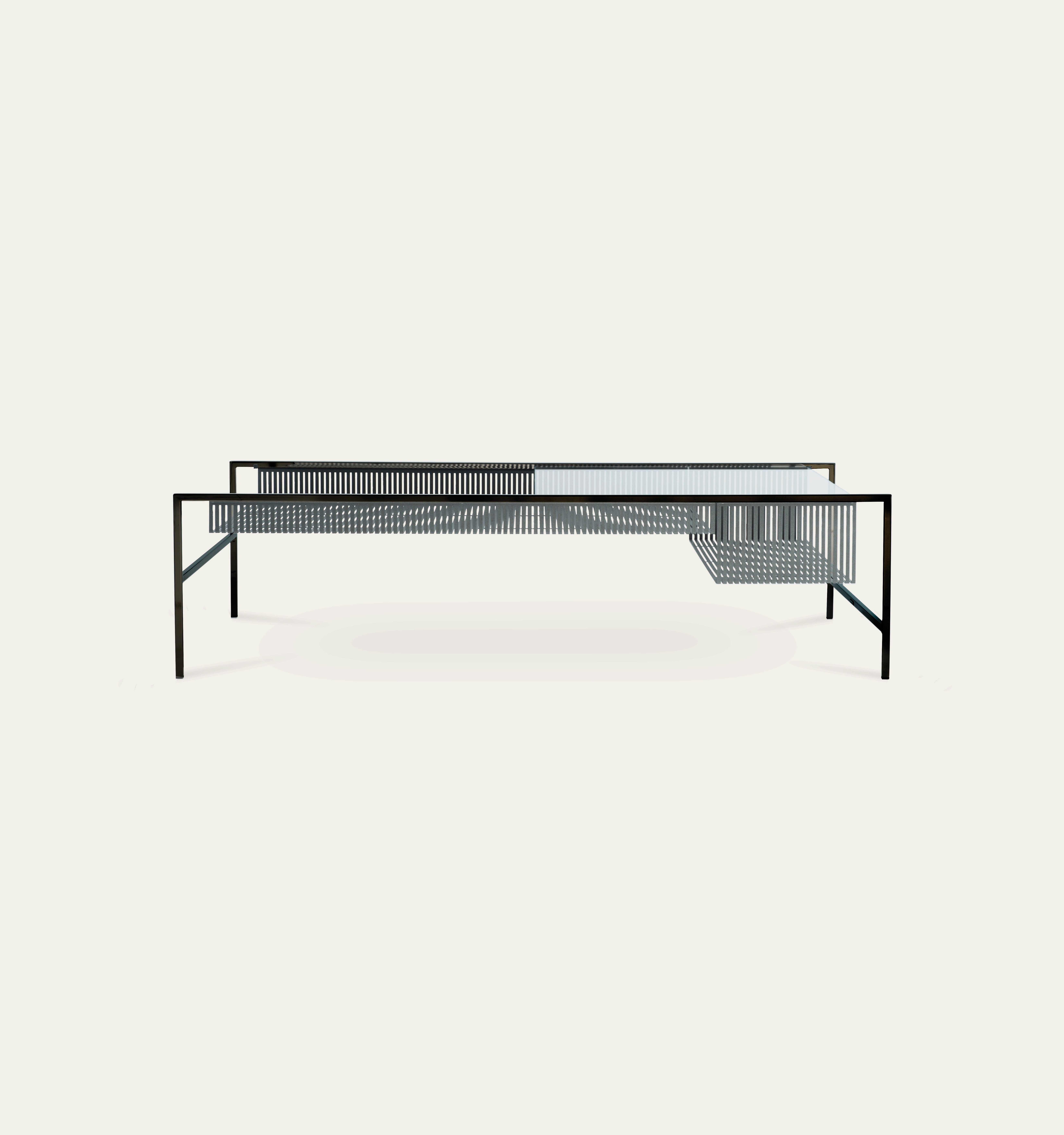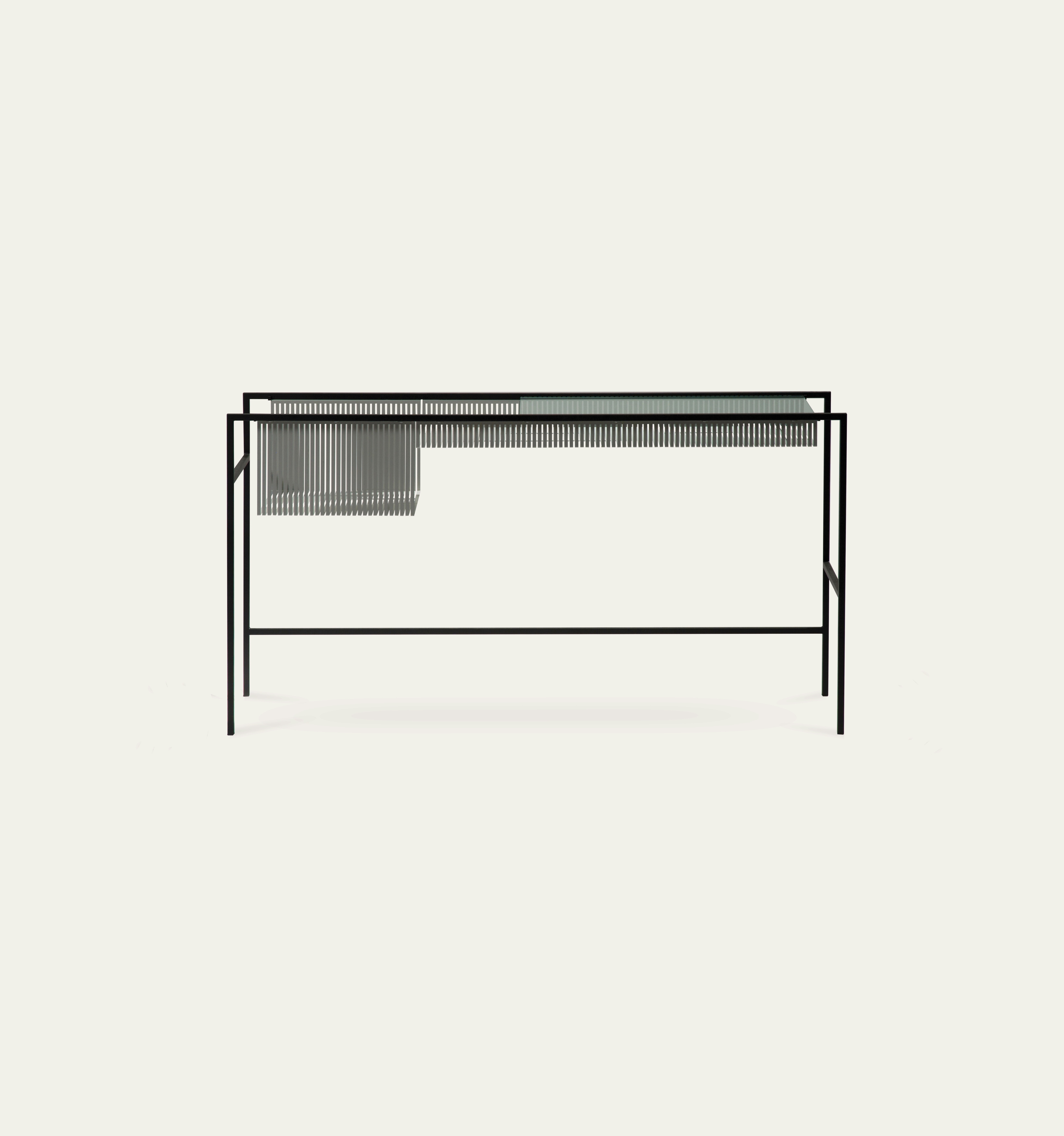 Refinement of the structure and the effects of shifting and transparency make this collection objects of discreet elegance. The sliding glass shelf adds practical mobility.