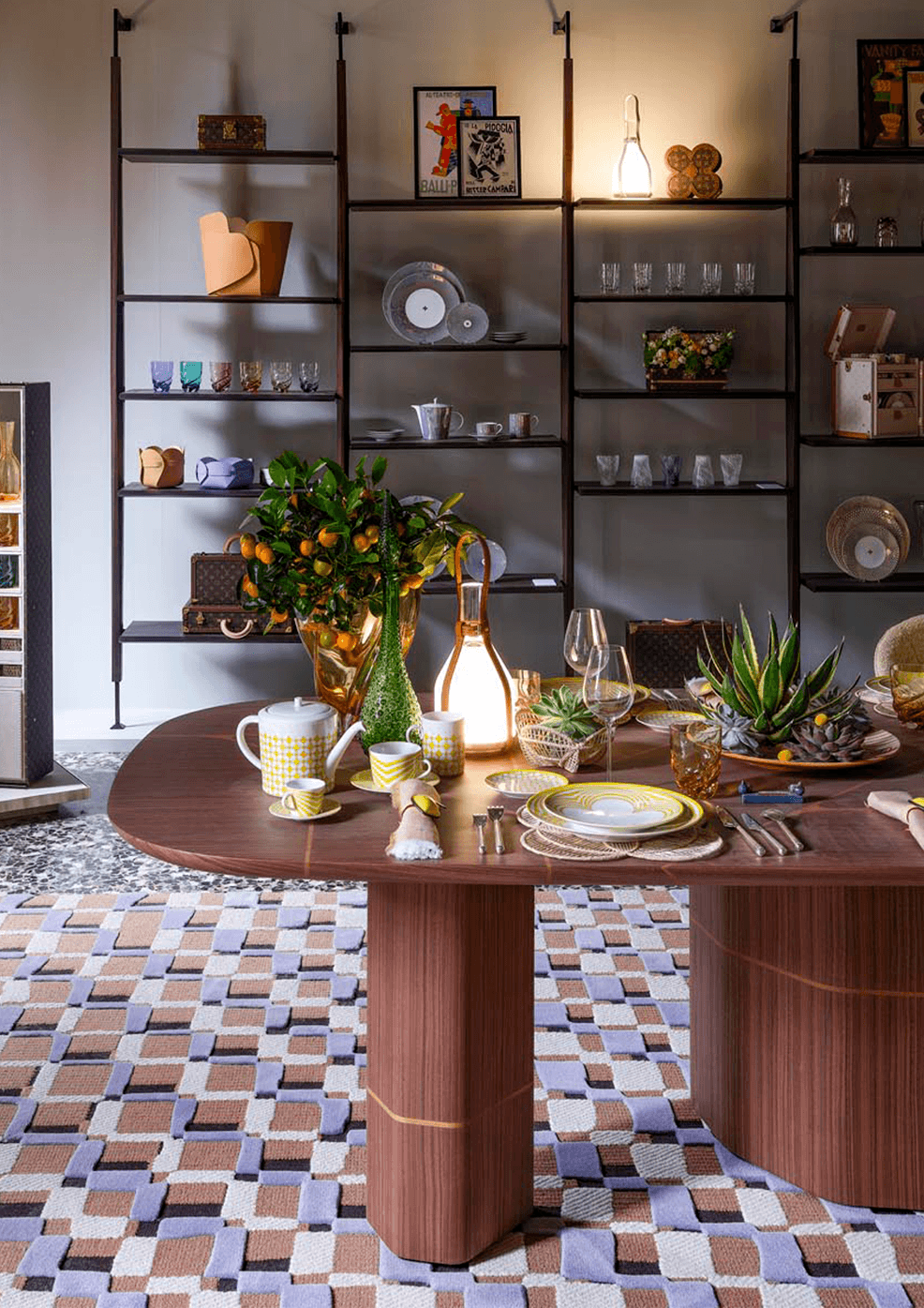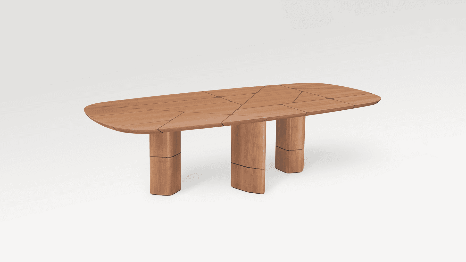 Once in the home, the Atlas table takes its place like a veritable sculpture. Atlas is constructed from a blend of onyx and travertine, subtly tracing the Monogram diamond on its diaphanous top. The table is also available in a walnut and light wood version. lts ample size, thick tabletop and elegantly solid tri-faceted legs make this a noble design brimming with character.