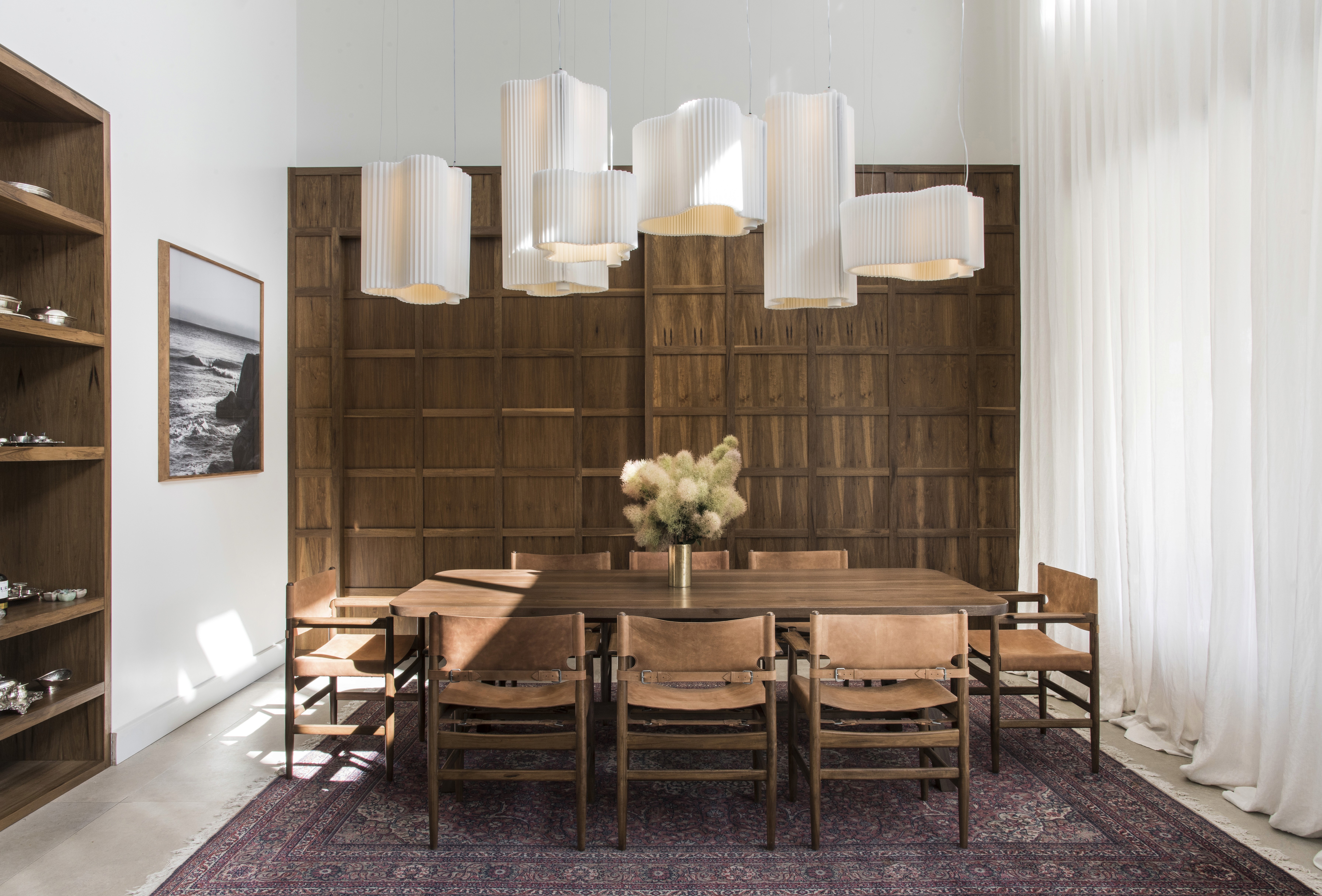 Suspension lamp composed of a metal tube tangent to a Duette® surface by Hunter Douglas® that spans the space. Galvanized steel tensioners and a transparent cable.