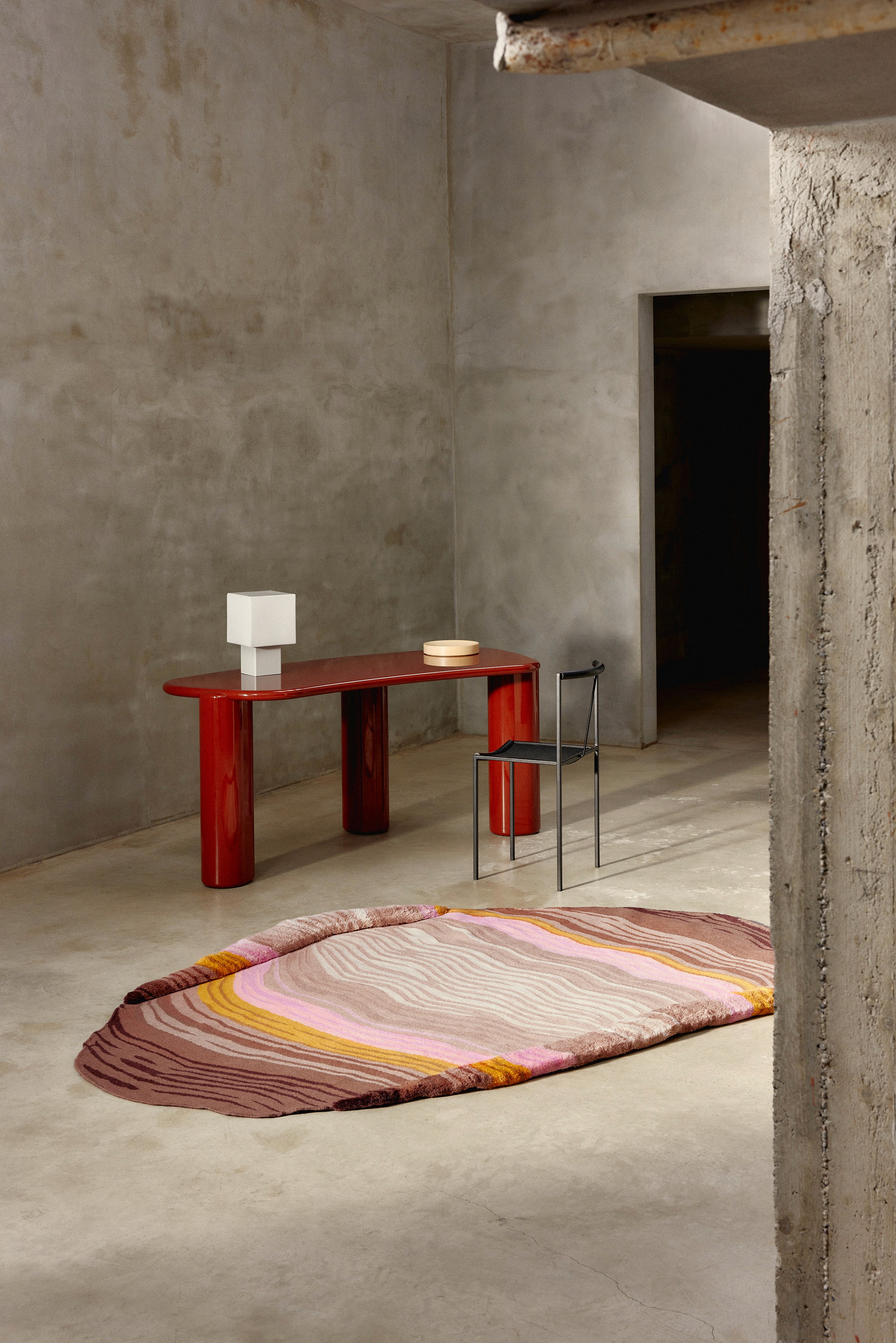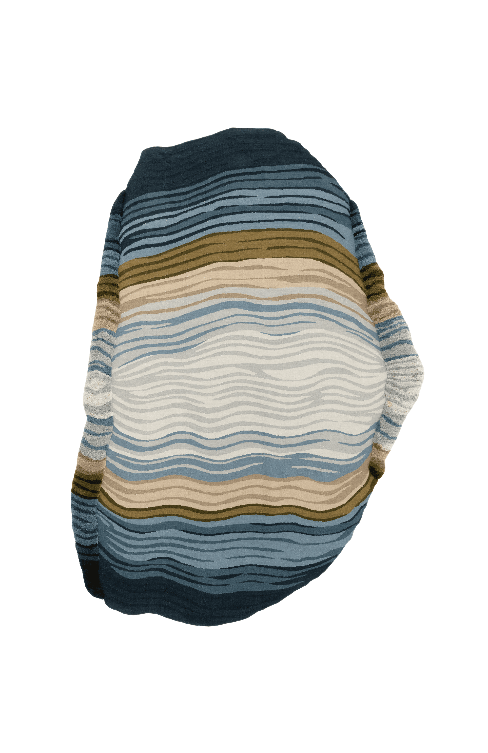 Irregular strokes expand and contract, rise and fold with grace onto each rug, creating a landscape in constant evolution. Like the gradual progression of geological formations, the lines echo the soft contours of stones, the spirals of seashells, the delicate shifts of wind-shaped landscapes. Gentle tones emerge, breathing life into the textile, where shadows and light blend in a quiet, natural harmony.