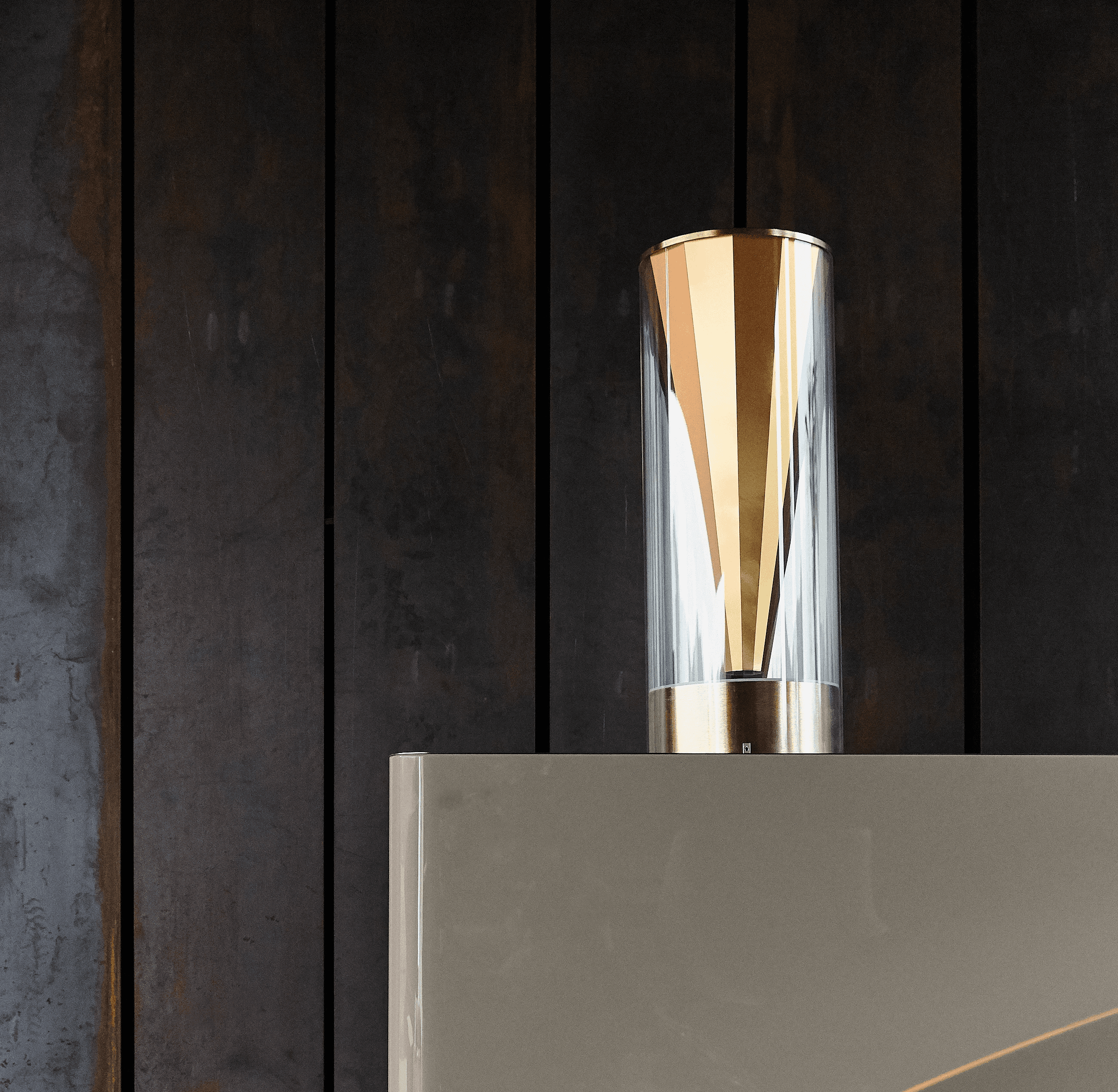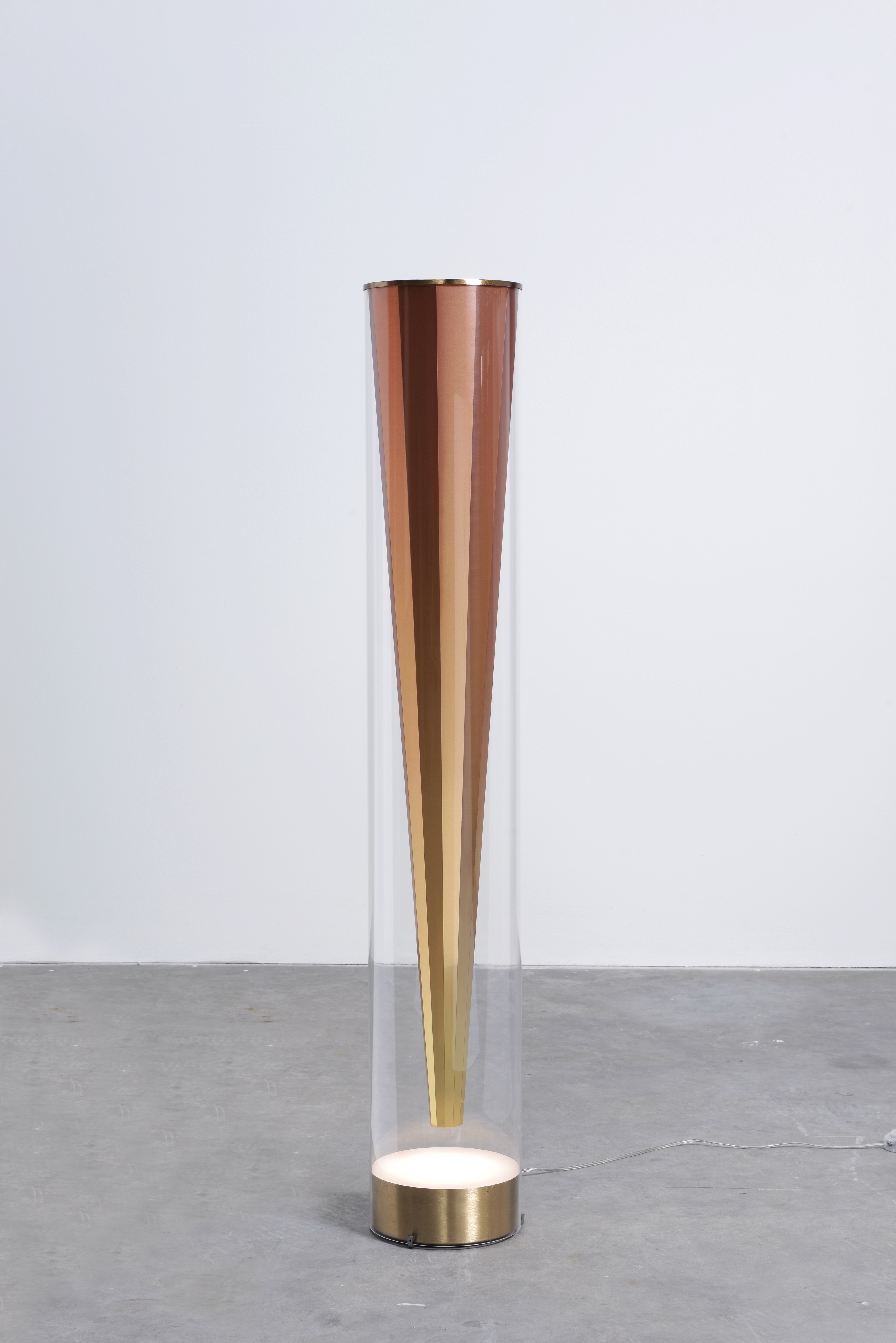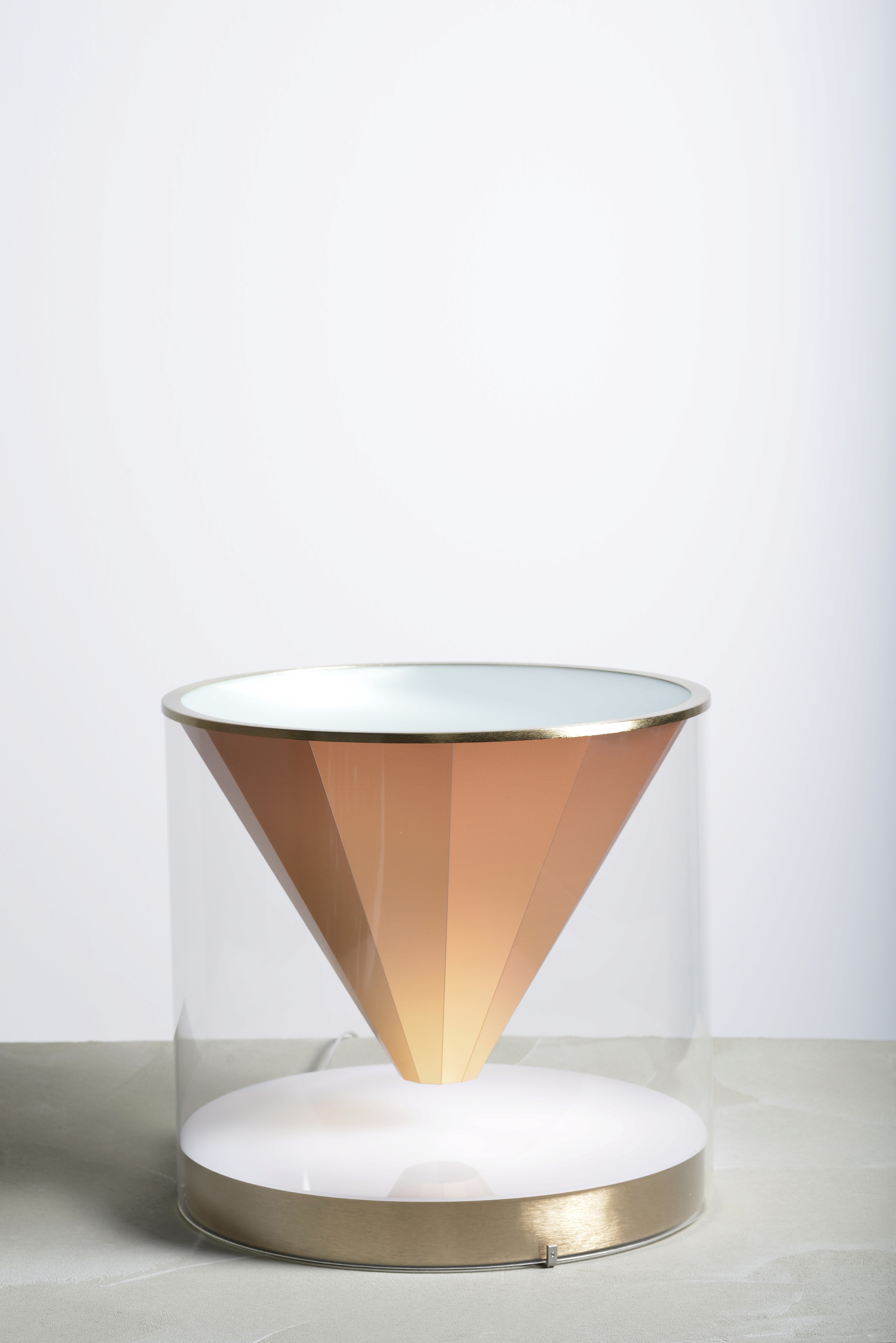 Pluma, a collection defined by its iconic shape: a faceted cone suspended within a clear acrylic tube. The cone never quite touches the base, creating the subtle illusion that it is floating. Its faceted surface captures and refracts the light, producing a shifting play of reflections that enhances this sense of weightlessness. The result is a piece that feels both precise and ethereal, where structure and light come together in quiet balance.