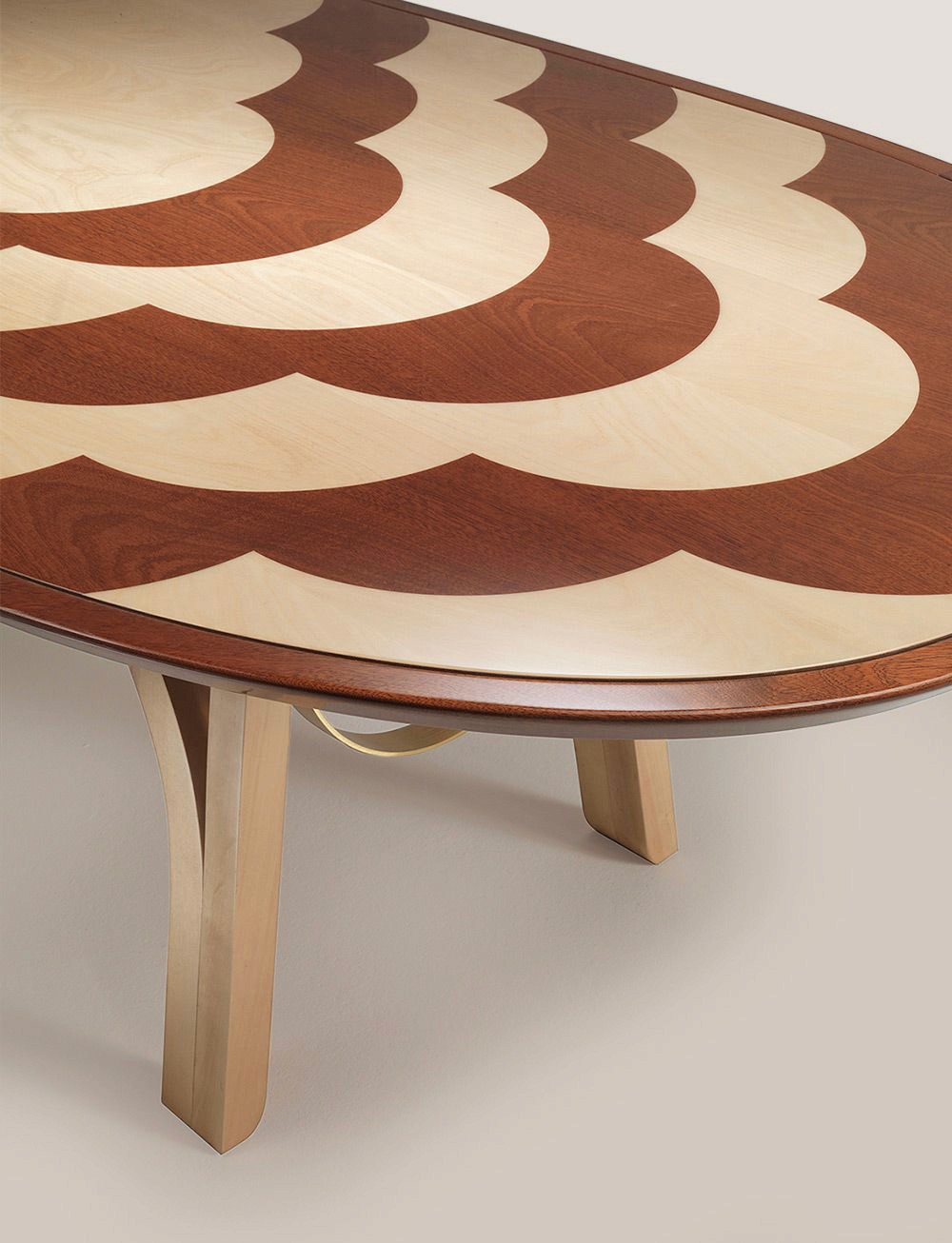 Una sucesión de arcos de orden simétrico se abre y expande sobre la superficie de la parte superior que se materializa en dos tipos y colores de chapas de madera que conforman una obra de arte que se valida por sí misma. La estructura base está compuesta por arcos que se elevan y ondulan, resultando en una estructura sólida en continuo diálogo con la morfología de la parte superior.