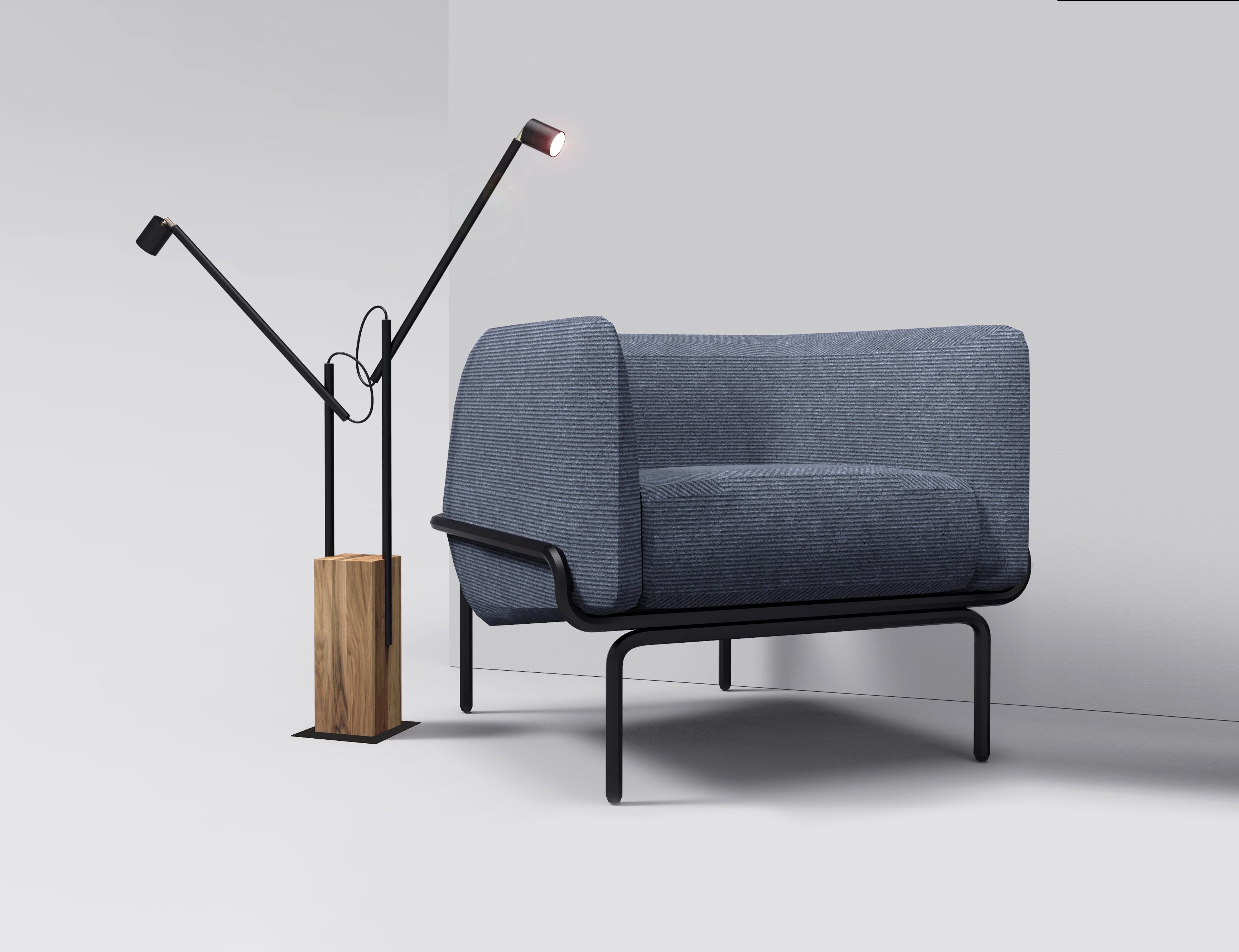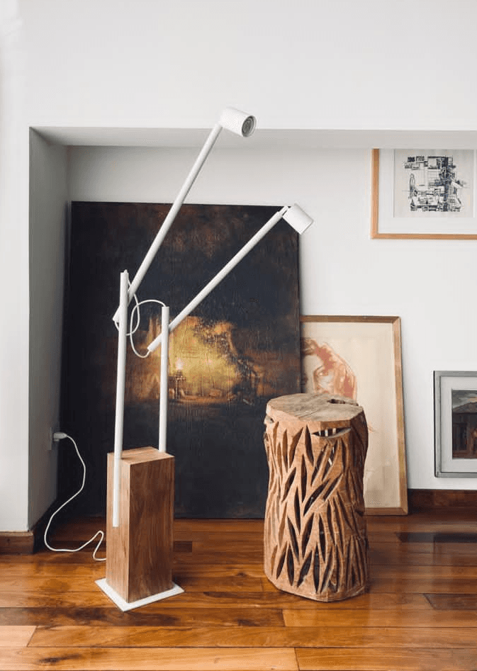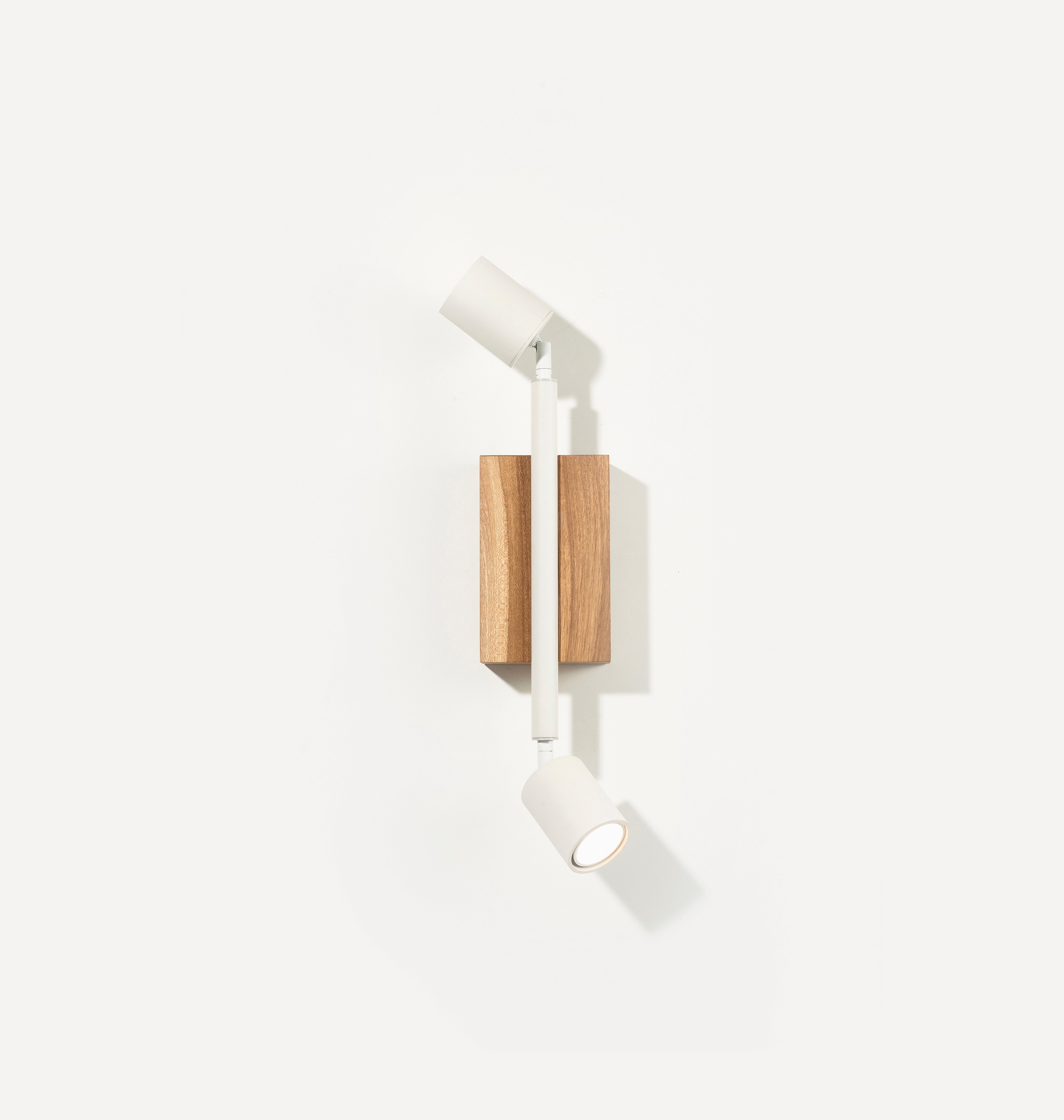 Lightning collection with a simple geometric design, predominantly featuring straight lines, combining the warmth of wood with the solidity of metal cylinders. Its adjustable head allows for precise direction of light in the space.