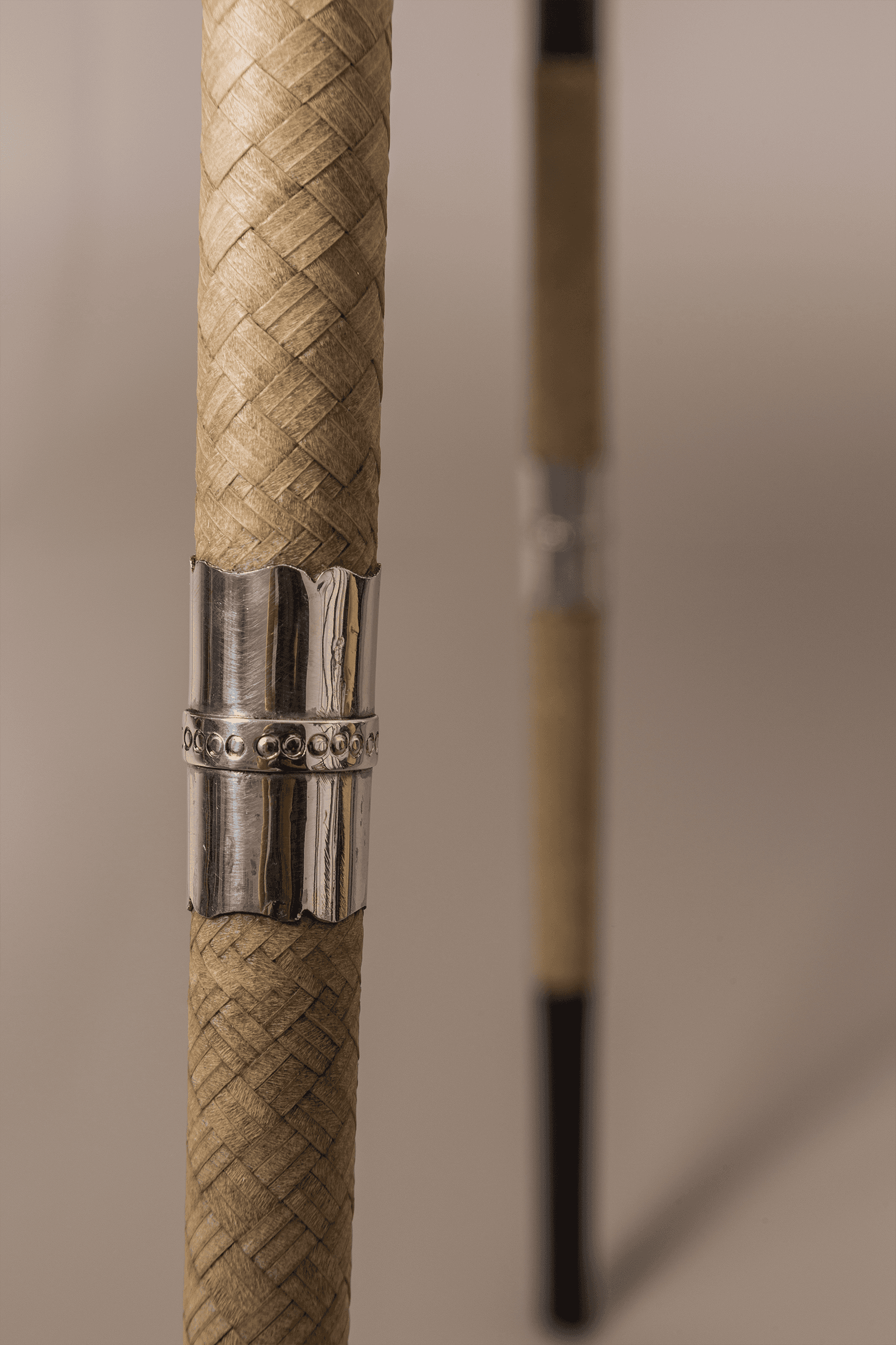 Techniques: Seat in cow leather with central seams on a 9 thong wovenwicker, tightened with clips and buttons made with the same leather. Handle and backrest wrapped in leather with internal seams. Legs covered in awl knit (warp and weft system) with horse leather strips and silver 900 hammered and chiseled bracelets.
