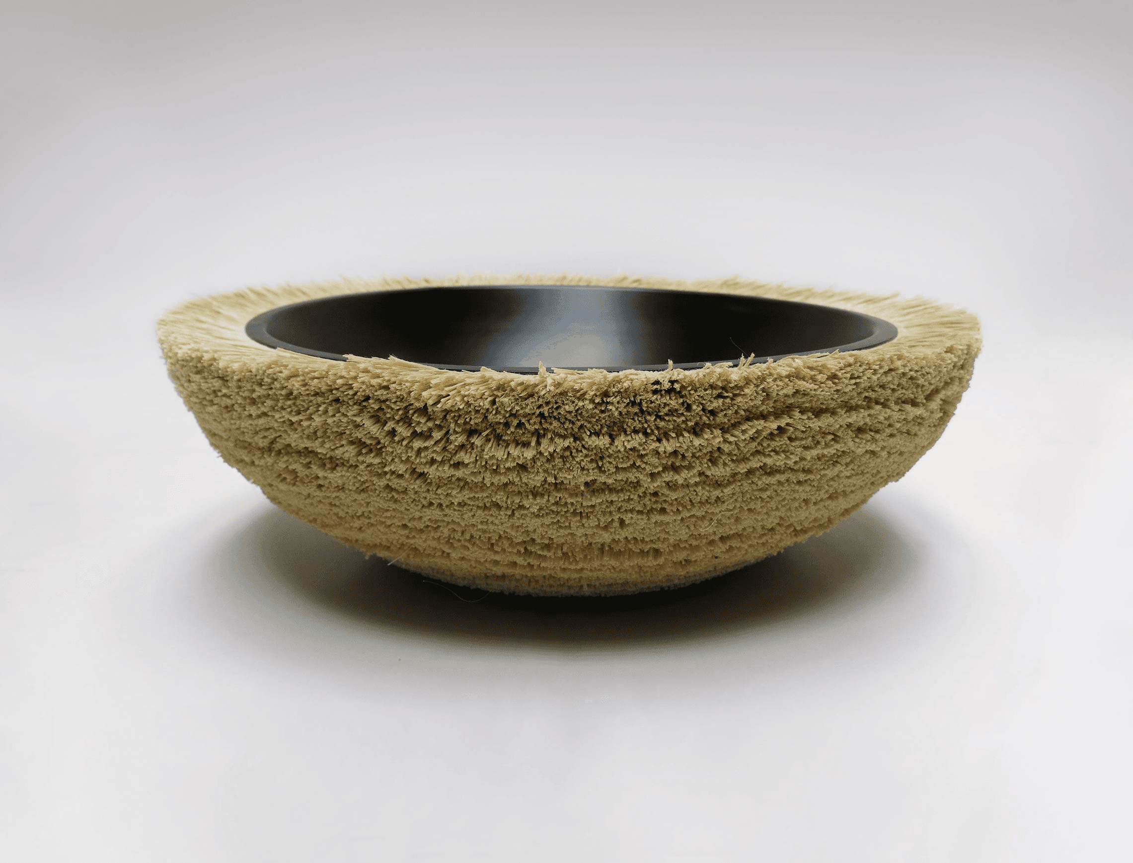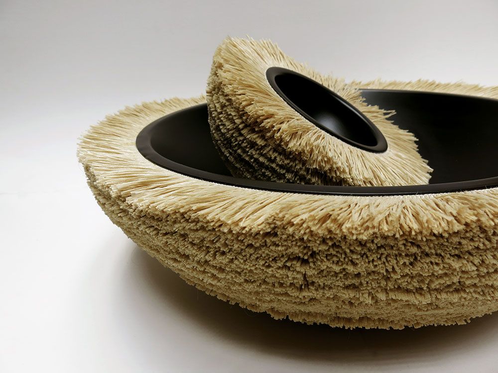 'Ninho' uses as the main material discarded carpet edges; overlapping layers result in volumes that seem to grow around the object containing its perimeter. Once again the designer Cristián Mohaded takes a discarded part of a massive production industry to an object of contemplation that becomes a provocation to the senses achieved from the unconventional use of a material. NINHO is presented as a collection of mirrors and bowls in different sizes and curved shapes that give place to rounded surfaces generated by the filaments. The material is presented as a rigid coat fur forming defined surfaces and volumes. A natural appearance and color resembles an animal fur dressing the object.