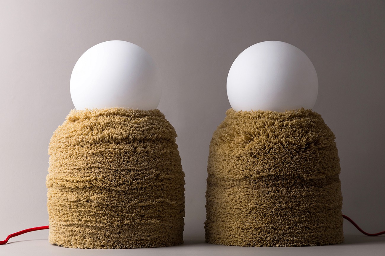 Ninho uses as the main material discarded carpet edges; overlapping layers result in volumes that seem to grow around the object, containing its perimeter. Once again the designer Cristián Mohaded takes a discarded part of a massive production industry to an object of contemplation that becomes a provocation to the senses achieved from the unconventional use of a material. Ninho is presented as a collection of mirrors and bowls in different sizes and curved shapes that give place to rounded surfaces generated by the filaments. The material is presented as a rigid coat fur forming defined surfaces and volumes. A natural appearance and color resembles an animal fur dressing the object.