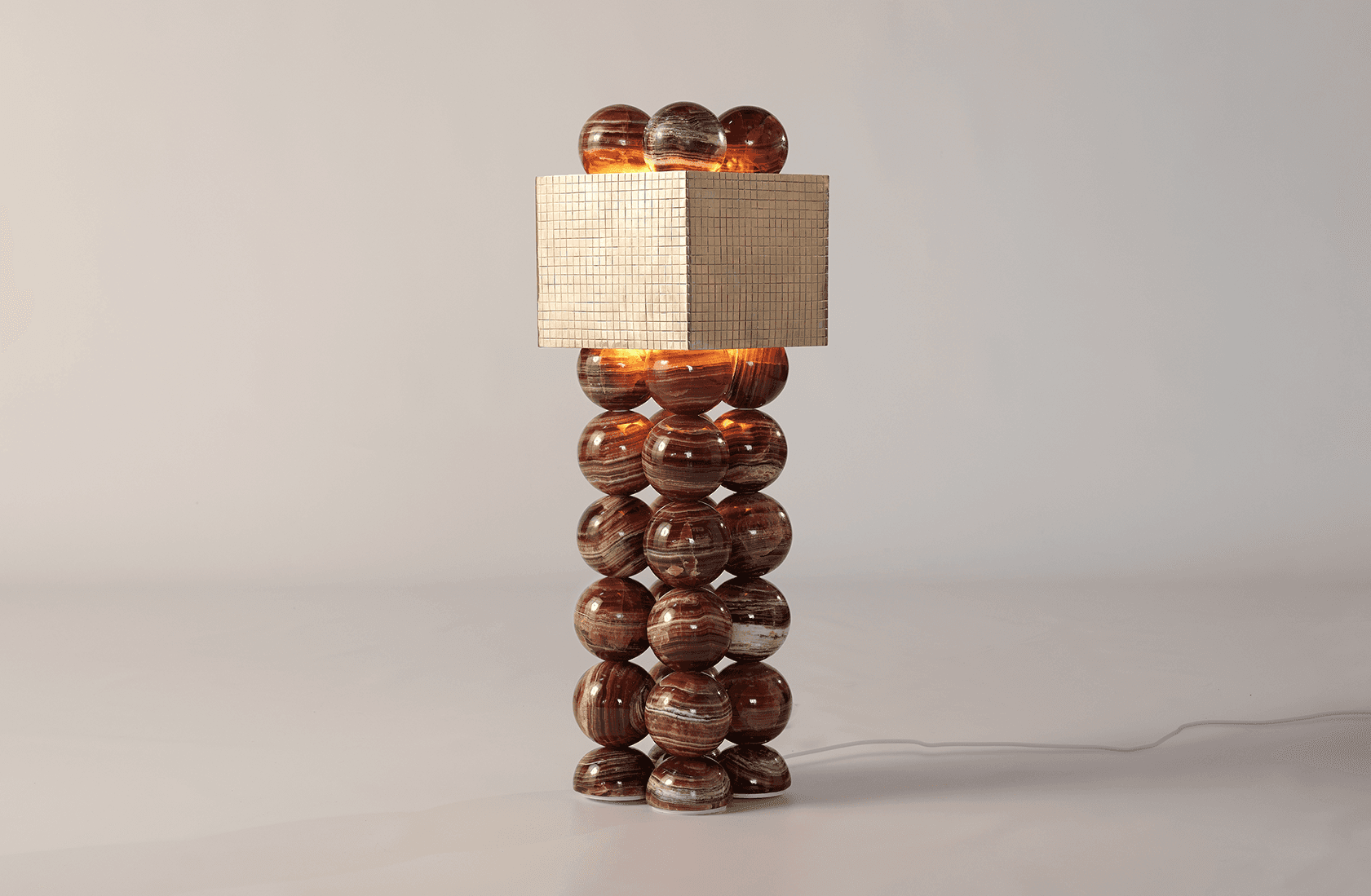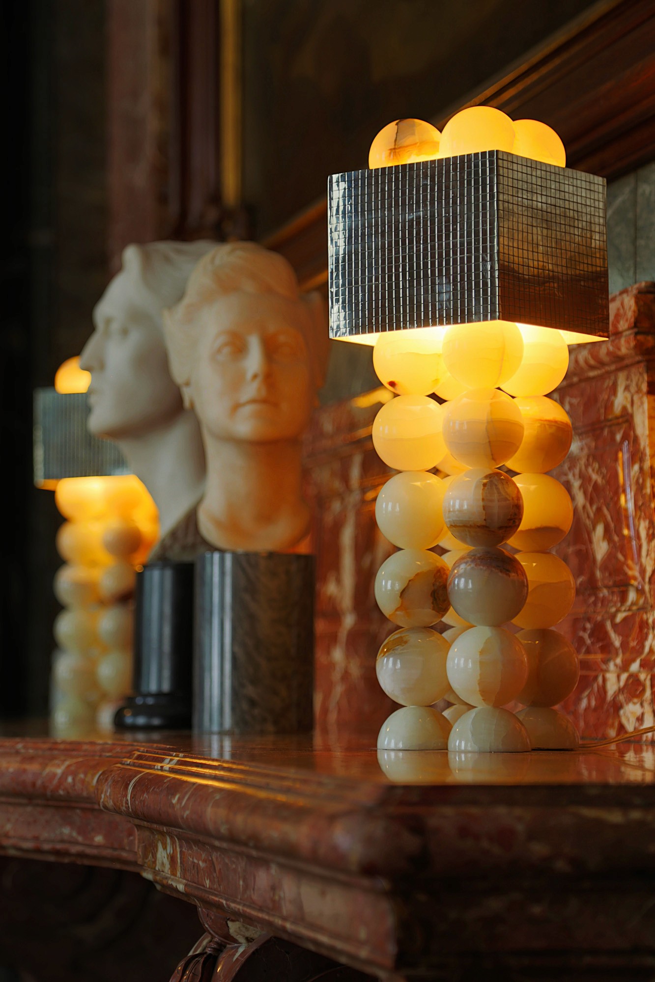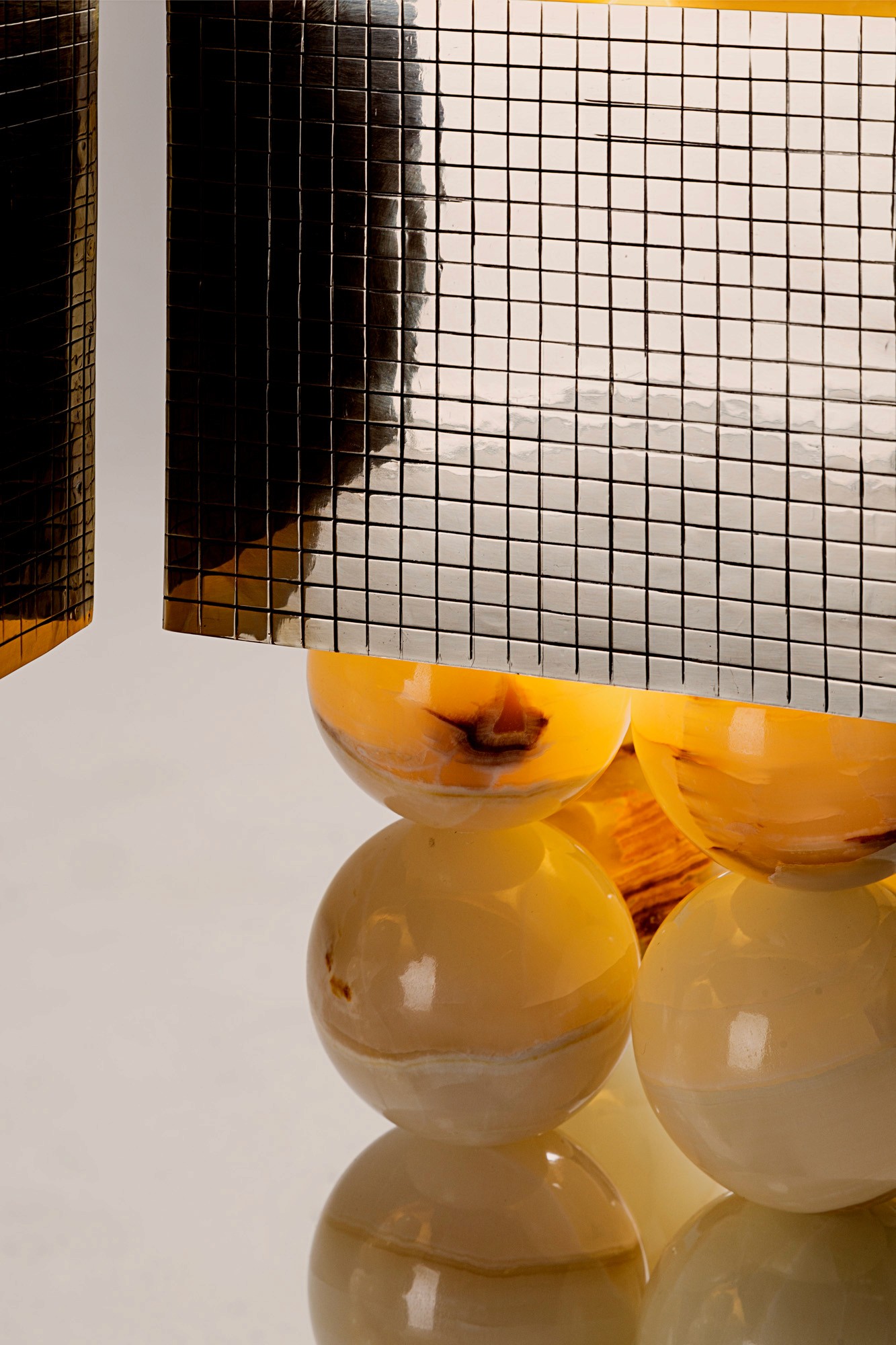 The table lamp’s structure consists of a sequence of lathe-modeled white onyx spheres using stone mined in Los Andes, Salta province. The diffuser’s white onyx lids and screen are made of nickel silver film produced by hand in Córdoba city. Assembled in Buenos Aires.