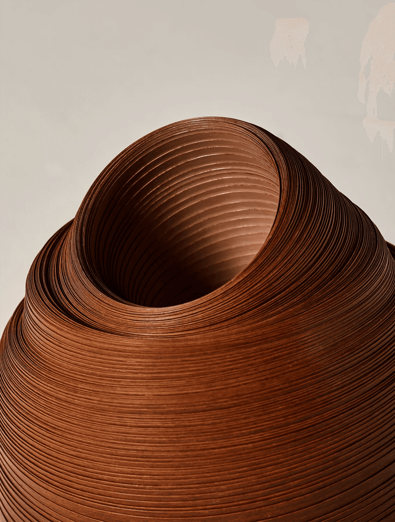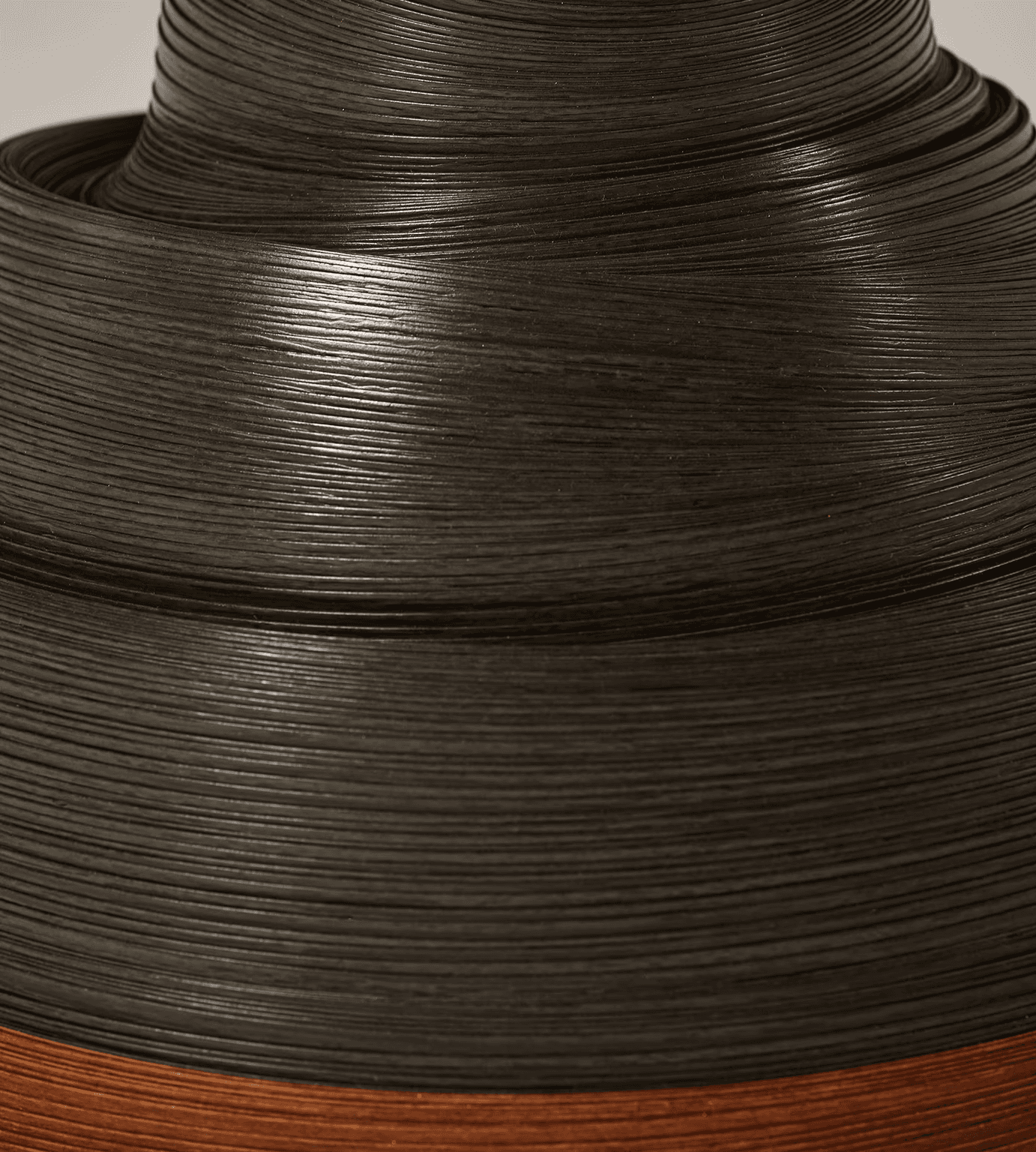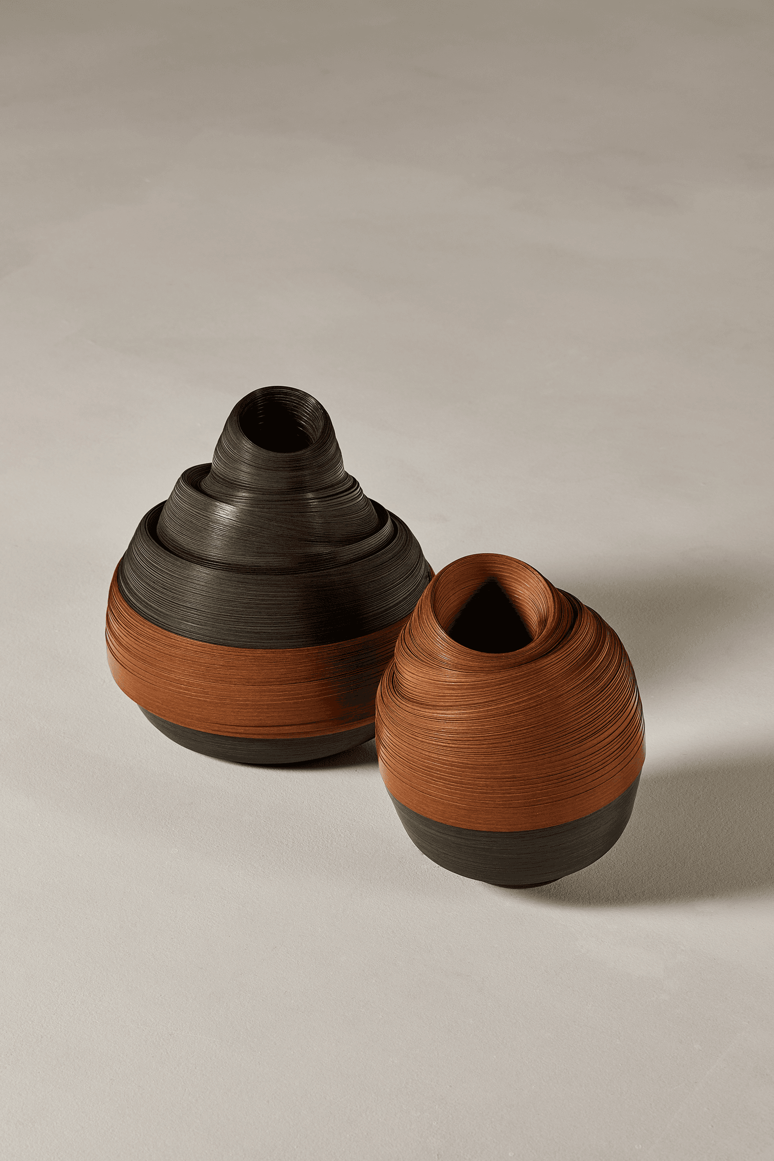 Its random and asymmetrical shape results from the joint of PVC edge bands rolls, which come in different widths, colors and textures; giving birth to this collection of vases that seem to be in constant movement and transformation.