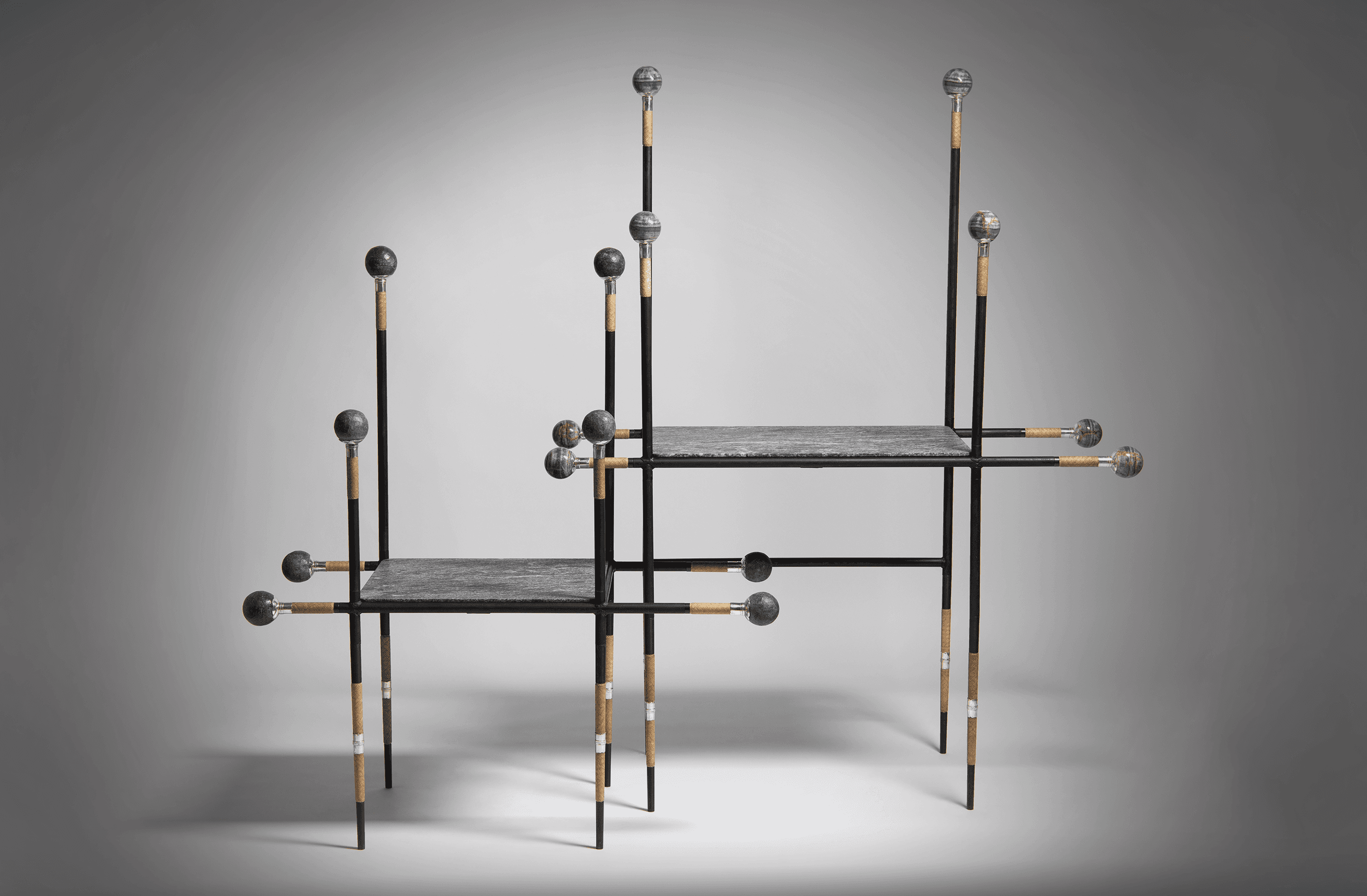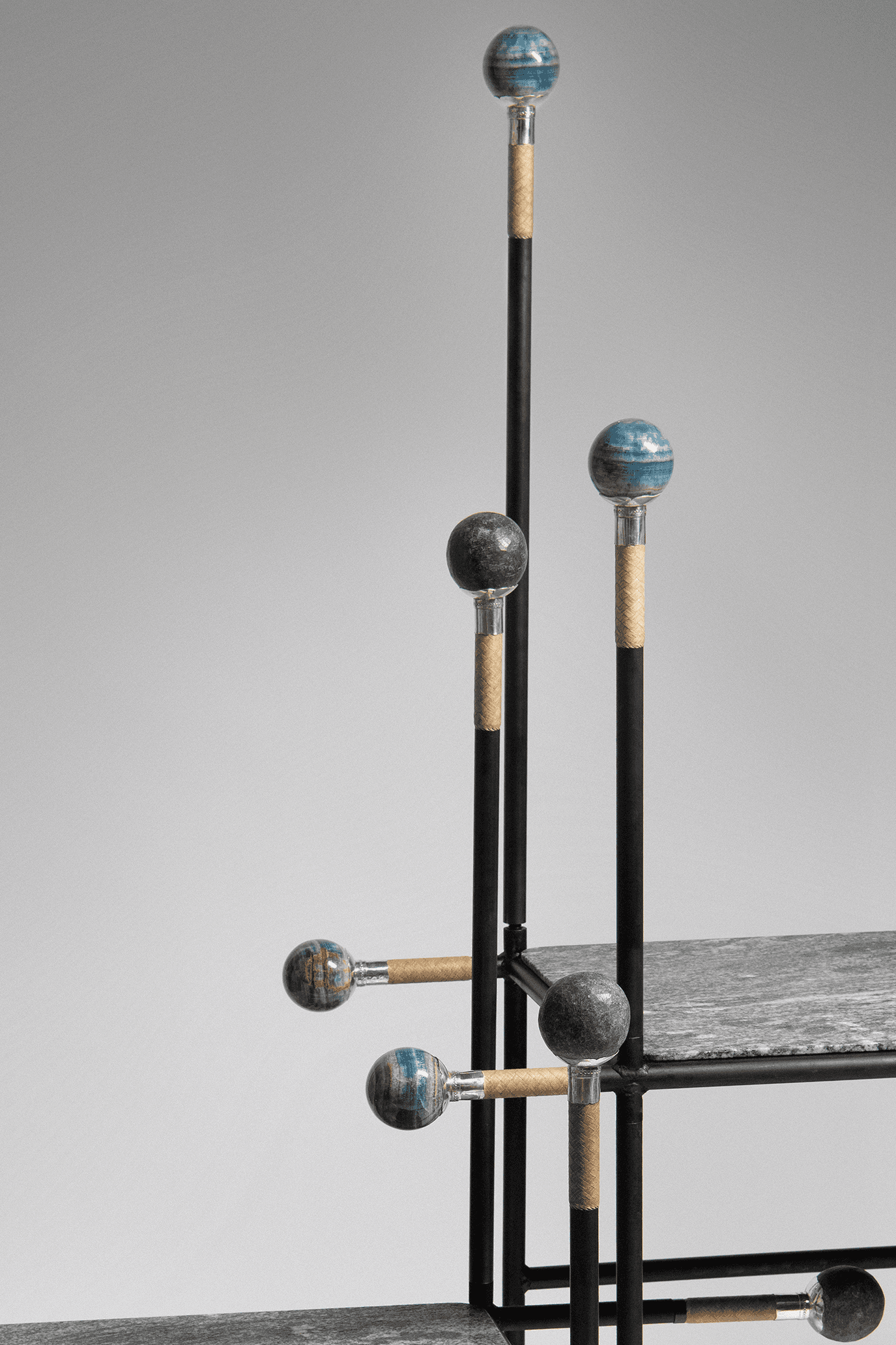 Legs covered in awl knit (warp and weft system) with horse leather strips and silver 900 hammered and chiseled bracelets. Tip of grips in turned blue Onyx stone with hammered and chiseled embossed cup in silver 900.